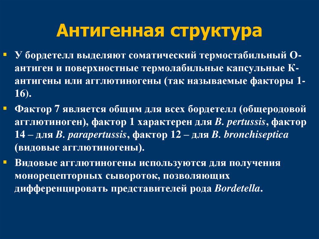 У бордетелл выделяют соматический термостабильный Оантиген и поверхностные термолабильные капсульные Кантигены или агглютиногены (так называемые факторы 116).Фактор 7 является общим для всех бордетелл (общеродовой