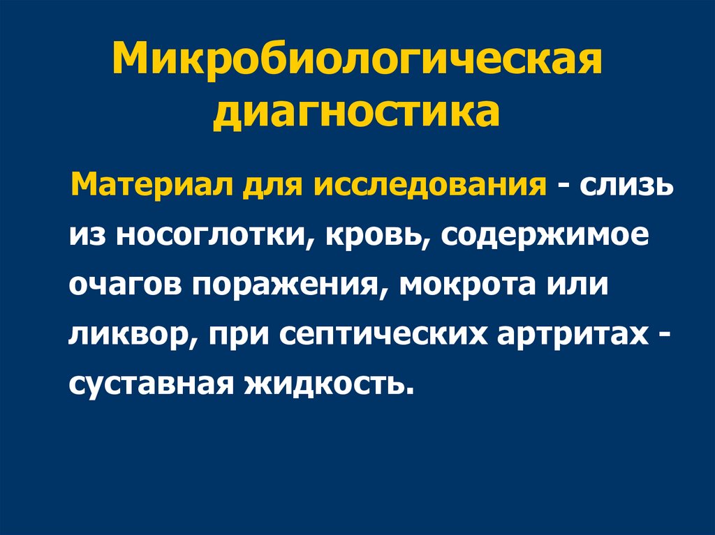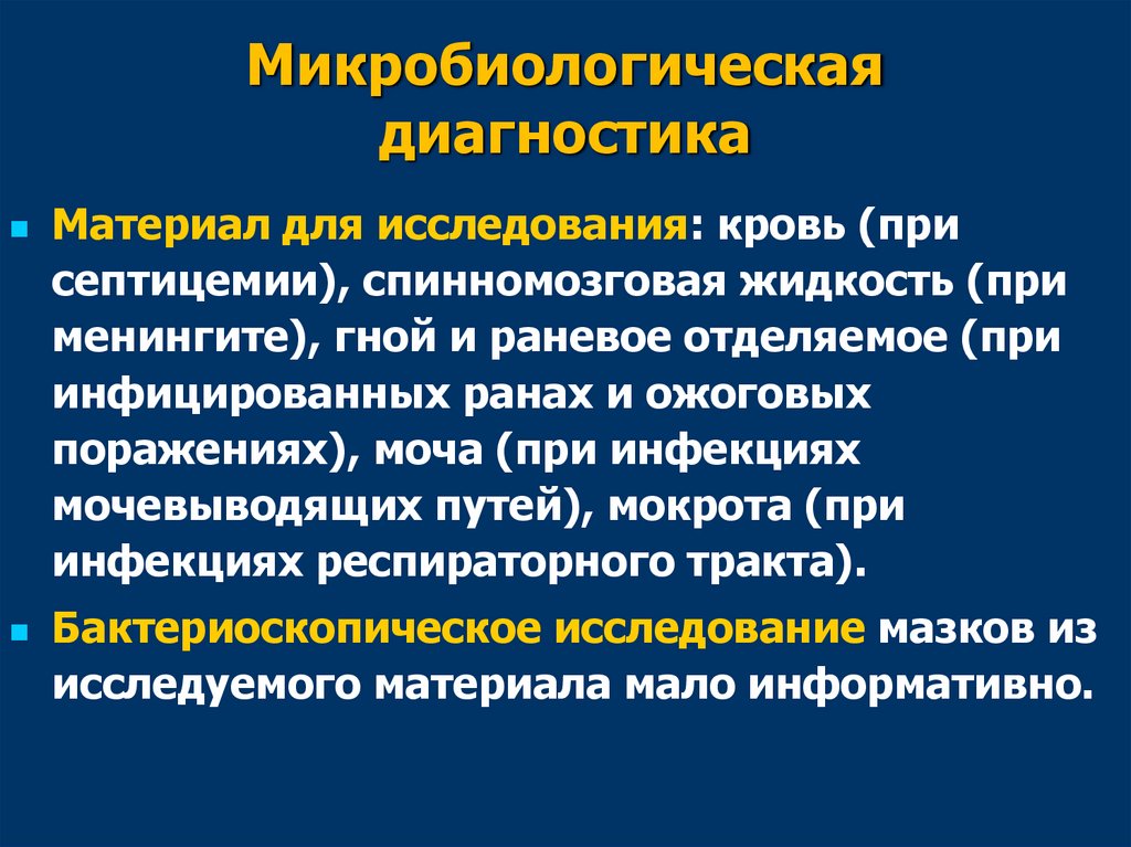 Материал для исследования: кровь (присептицемии), спинномозговая жидкость (при