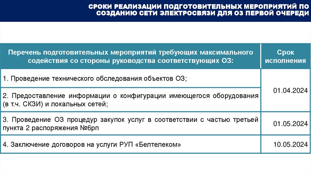 СРОКИ РЕАЛИЗАЦИИ ПОДГОТОВИТЕЛЬНЫХ МЕРОПРИЯТИЙ ПОСОЗДАНИЮ СЕТИ ЭЛЕКТРОСВЯЗИ ДЛЯ ОЗ ПЕРВОЙ ОЧЕРЕДИ