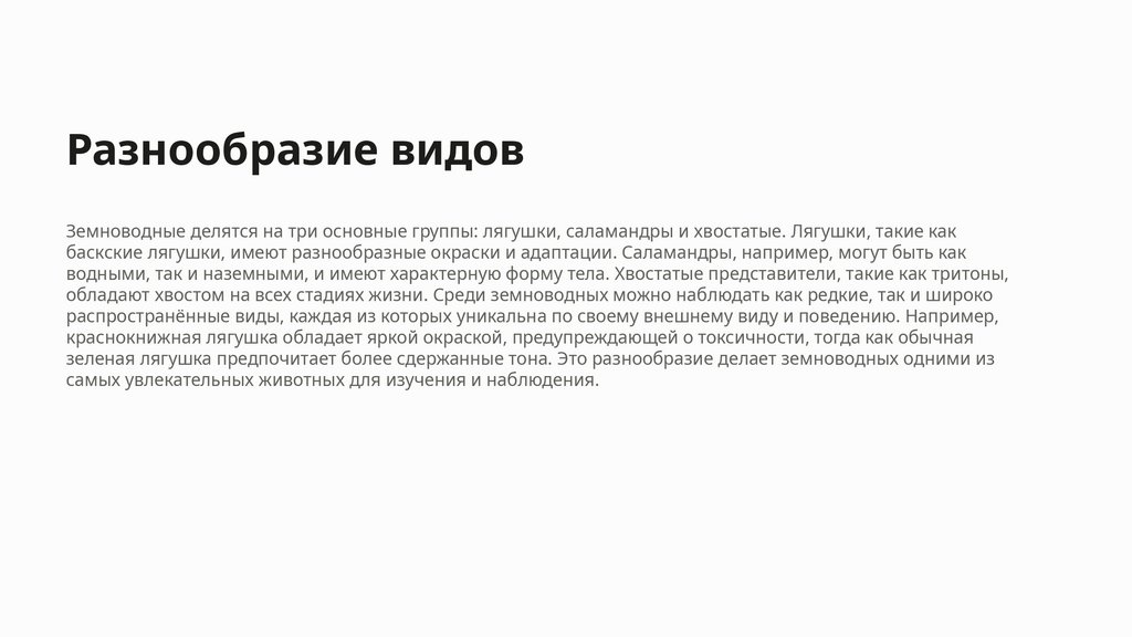Разнообразие видовЗемноводные делятся на три основные группы: лягушки, саламандры и хвостатые. Лягушки, такие как