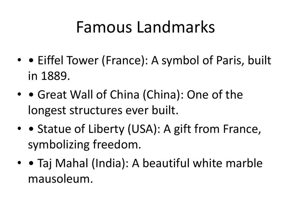 Famous Landmarks• • Eiffel Tower (France): A symbol of Paris, built