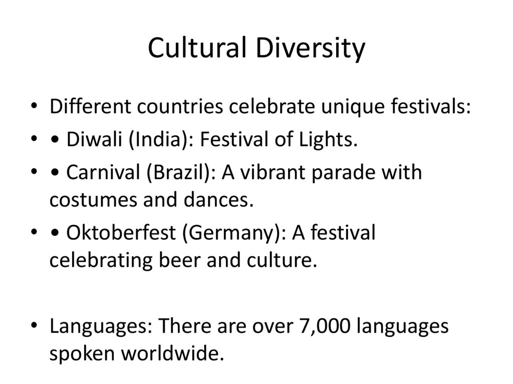 Cultural Diversity• Different countries celebrate unique festivals: