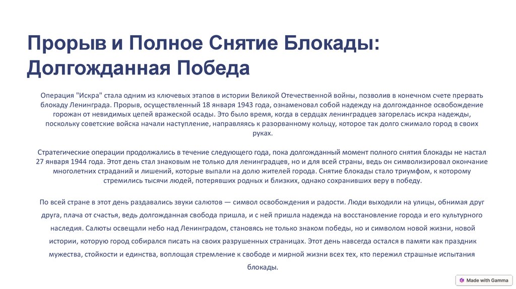 многолетних страданий и лишений, которые выпали на долю жителей города. Снятие блокады стало триумфом, к которому
