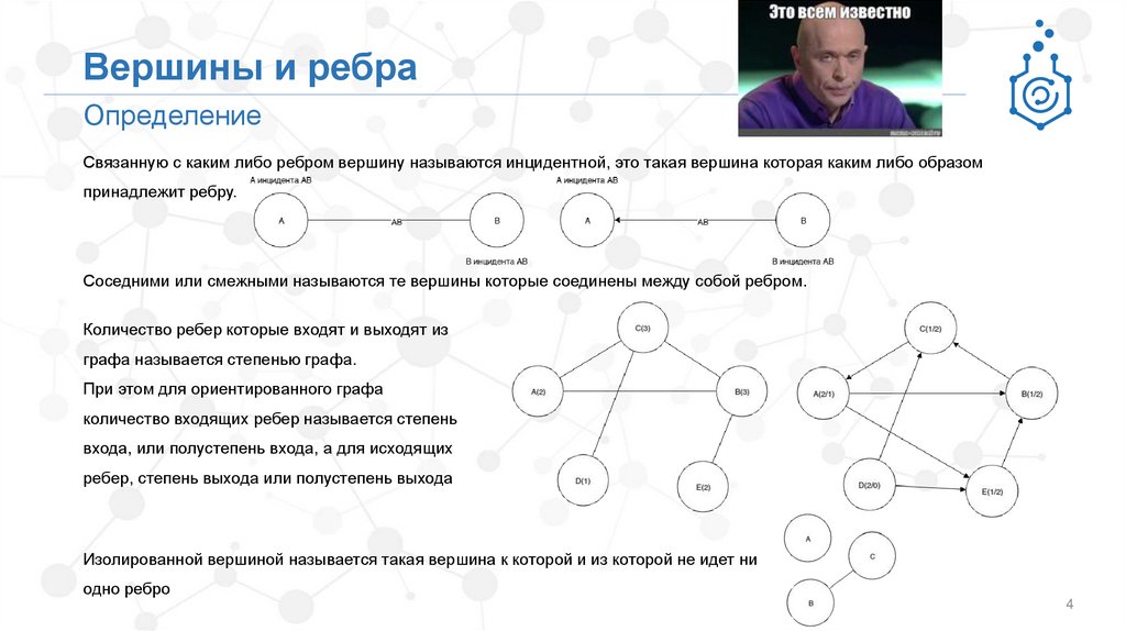 Связанную с каким либо ребром вершину называются инцидентной, это такая вершина которая каким либо образом