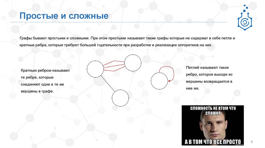 Простые и сложныеГрафы бывают простыми и сложными. При этом простыми называют такие графы которые не содержат в себе петли и
