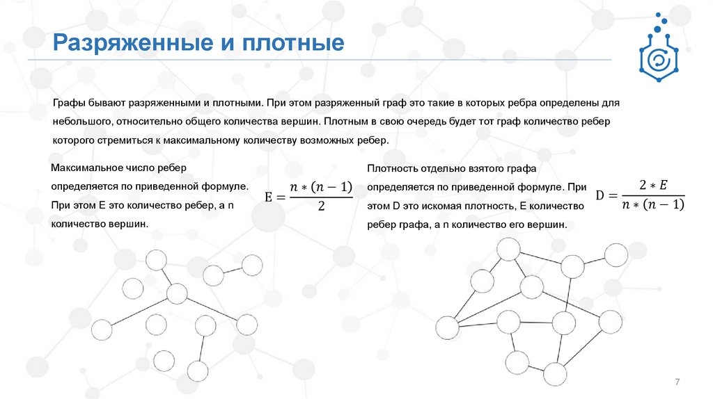 Разряженные и плотныеГрафы бывают разряженными и плотными. При этом разряженный граф это такие в которых ребра определены для
