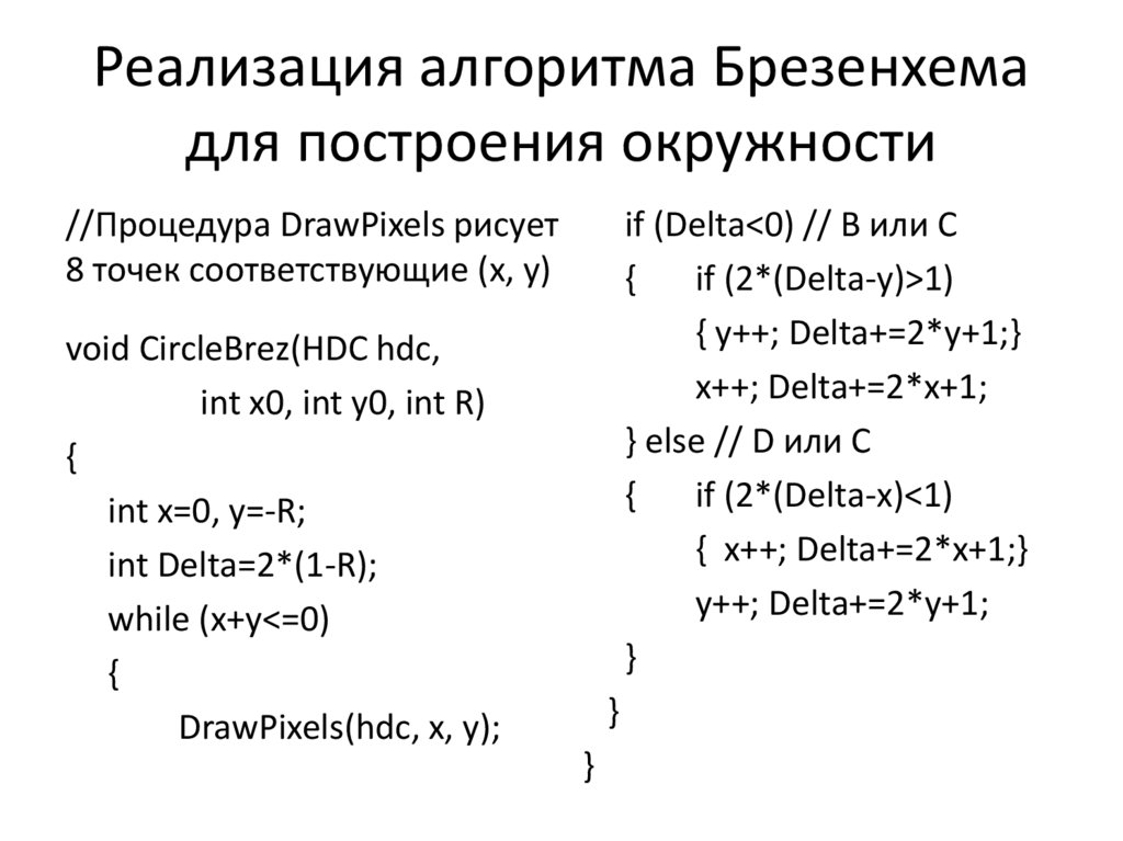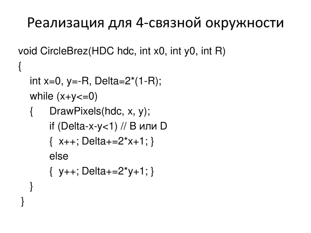 Реализация для 4-связной окружностиvoid CircleBrez(HDC hdc, int x0, int y0, int R)