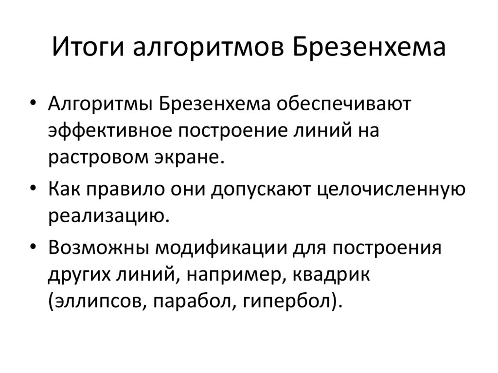 Итоги алгоритмов Брезенхема• Алгоритмы Брезенхема обеспечивают