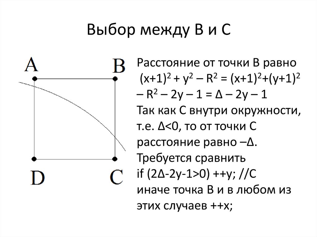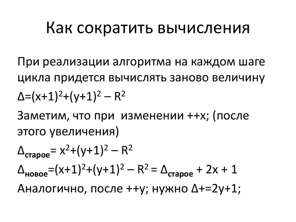Δновое=(x+1)2+(y+1)2 – R2 = Δстарое + 2x + 1
