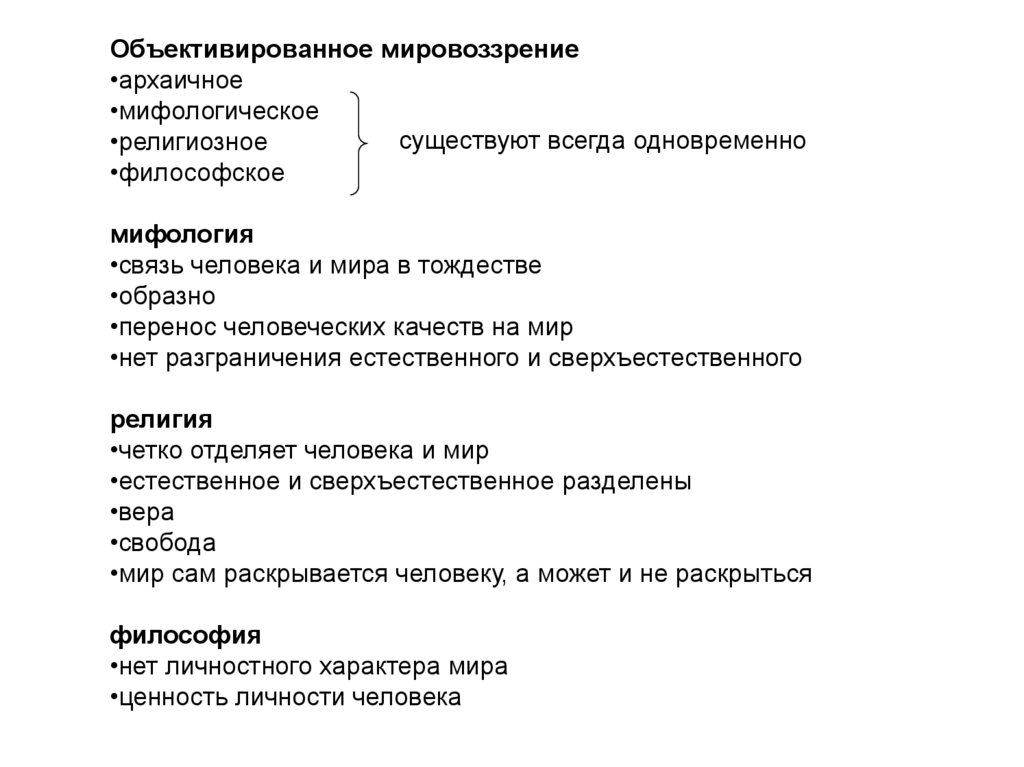 • ОБЪЕКТИВИРОВАННОЕ: мифология, религия, философия