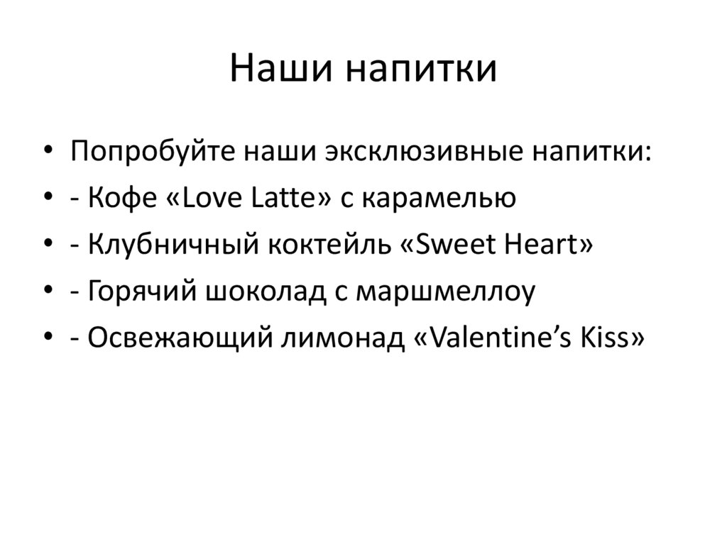 Наши напитки• Попробуйте наши эксклюзивные напитки: