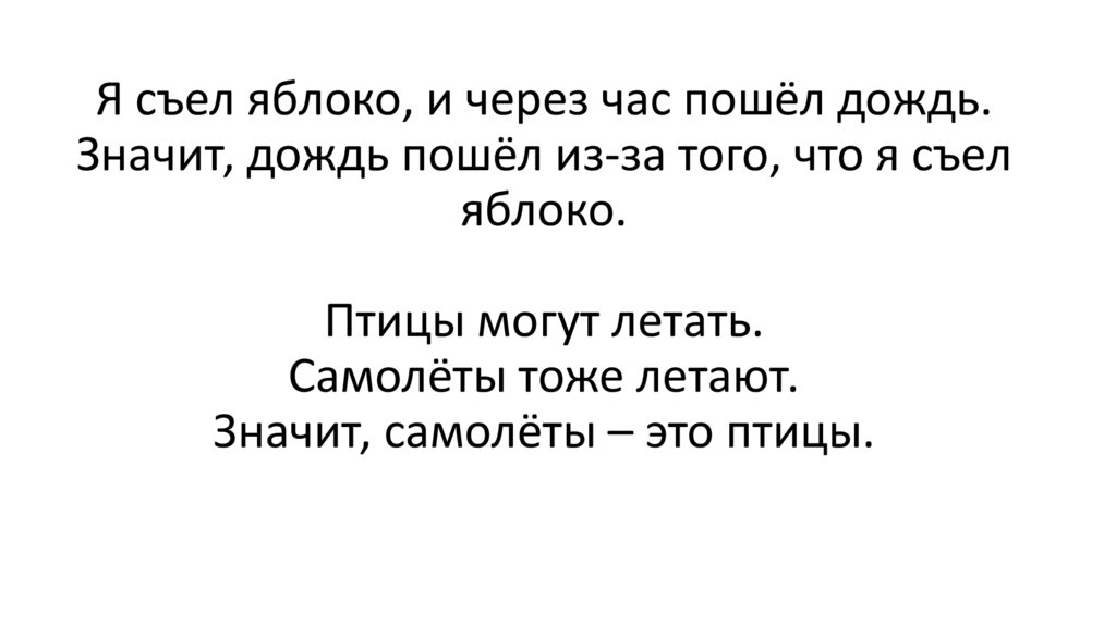 Я съел яблоко, и через час пошёл дождь.Значит, дождь пошёл из-за того, что я съел