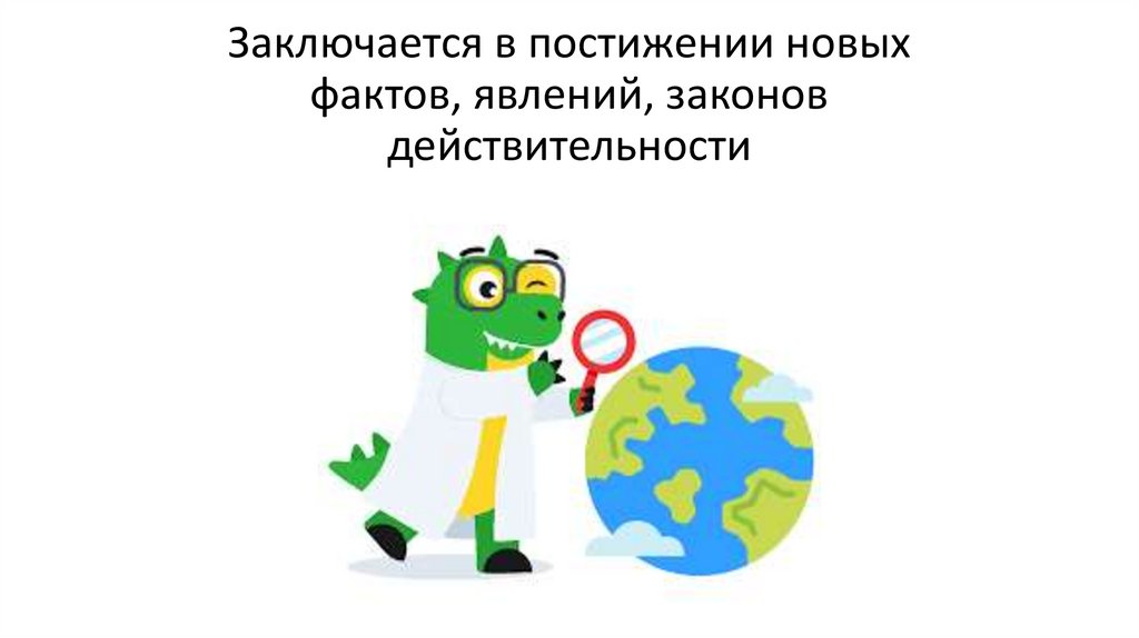 Заключается в постижении новыхфактов, явлений, законов
