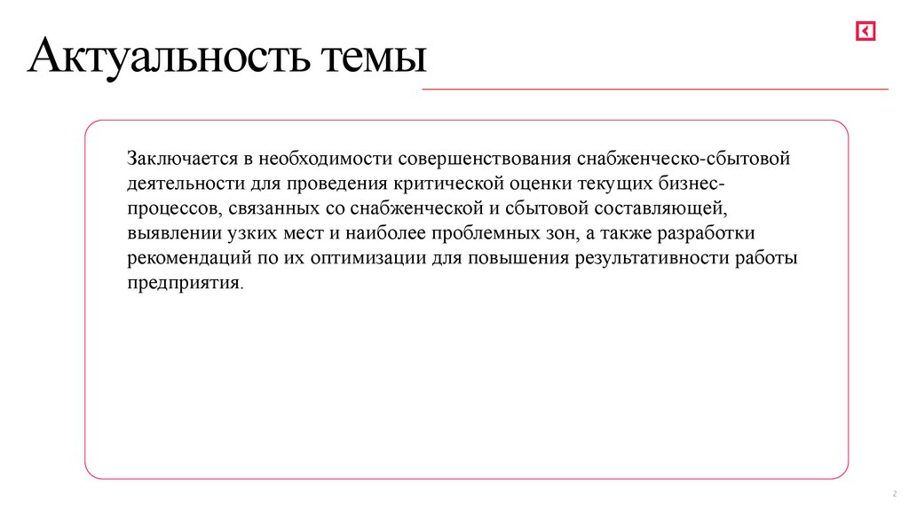 Актуальность темыЗаключается в необходимости совершенствования снабженческо-сбытовой