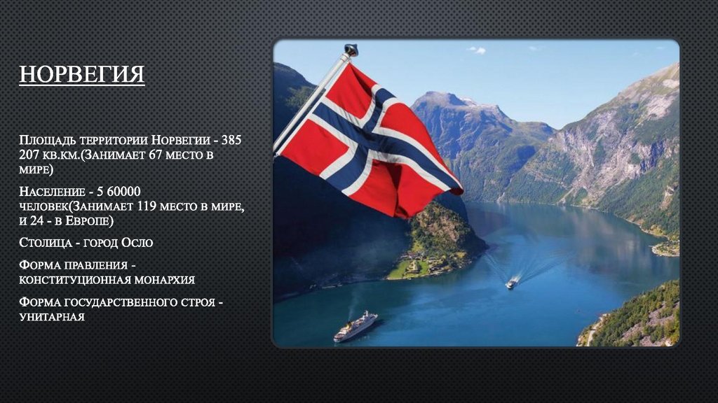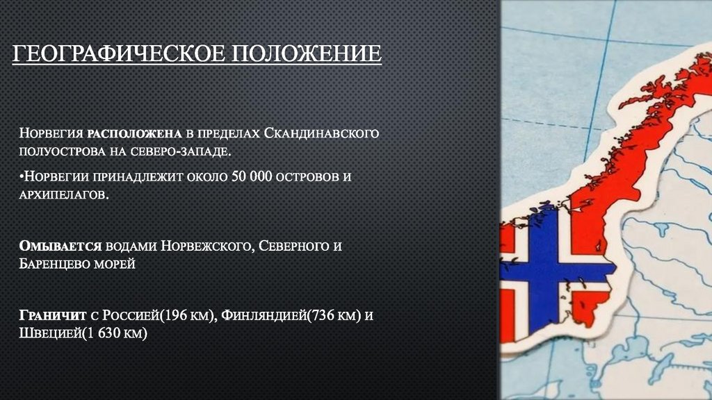 ГЕОГРАФИЧЕСКОЕ ПОЛОЖЕНИЕНОРВЕГИЯ РАСПОЛОЖЕНА В ПРЕДЕЛАХ СКАНДИНАВСКОГО