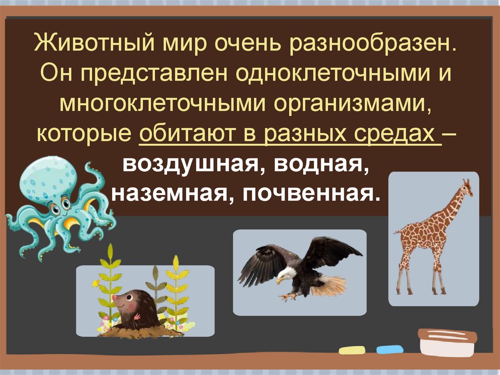 Животный мир очень разнообразен.Он представлен одноклеточными и