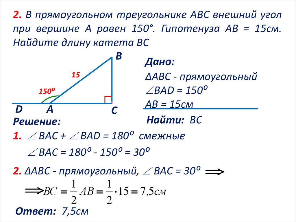 2. В прямоугольном треугольнике ABC внешний уголпри вершине A равен 150°. Гипотенуза АB = 15см.