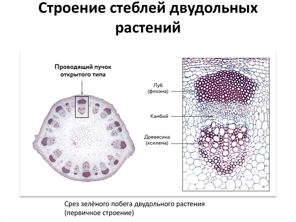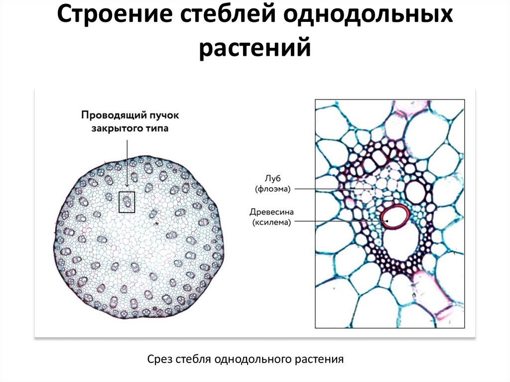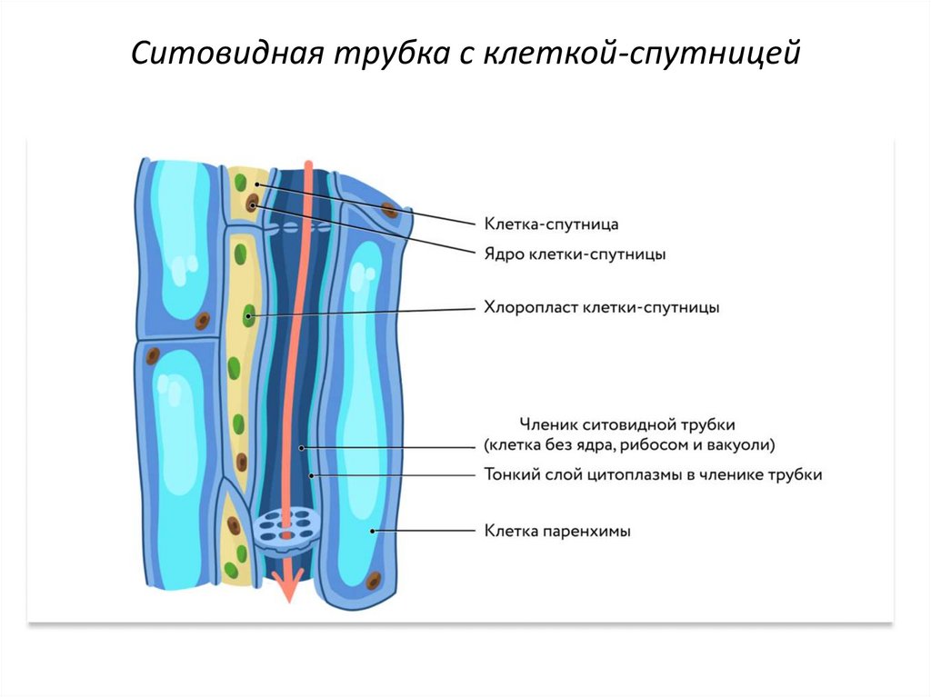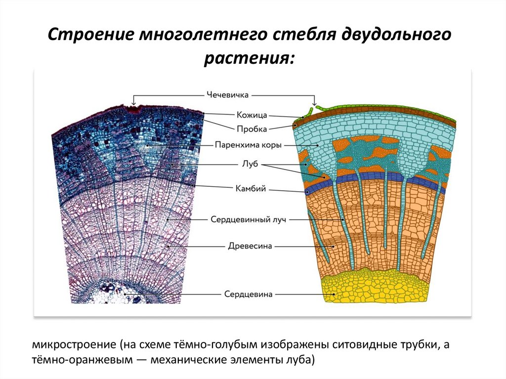 микростроение (на схеме тёмно-голубым изображены ситовидные трубки, а