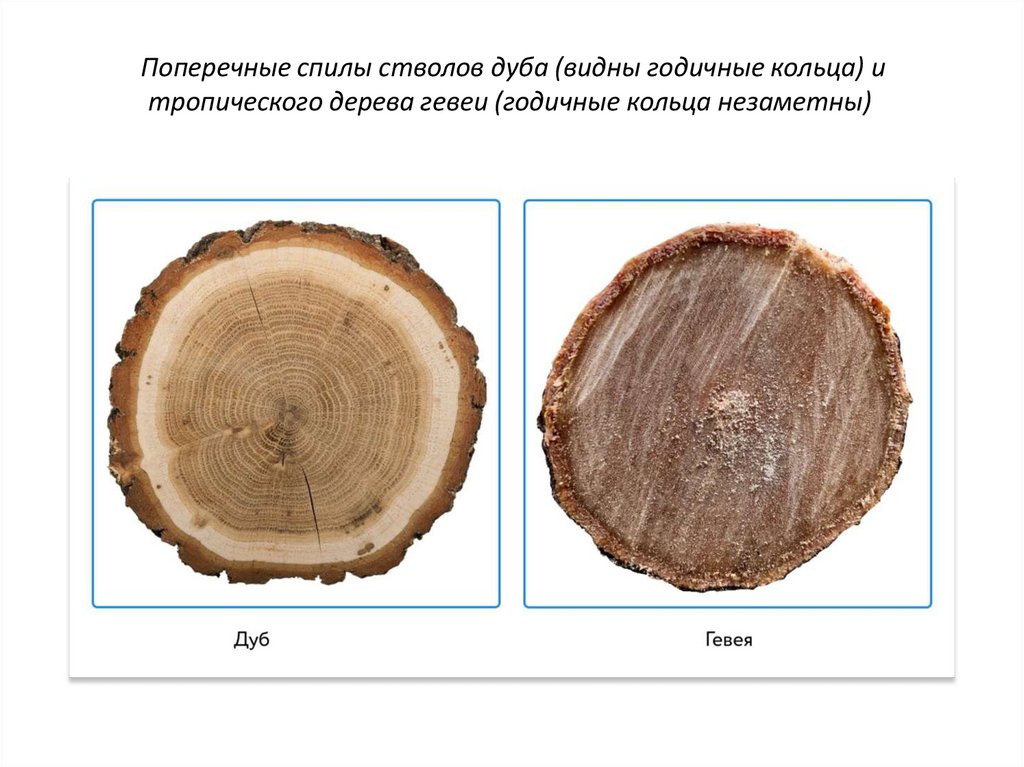 Поперечные спилы стволов дуба (видны годичные кольца) итропического дерева гевеи (годичные кольца незаметны)