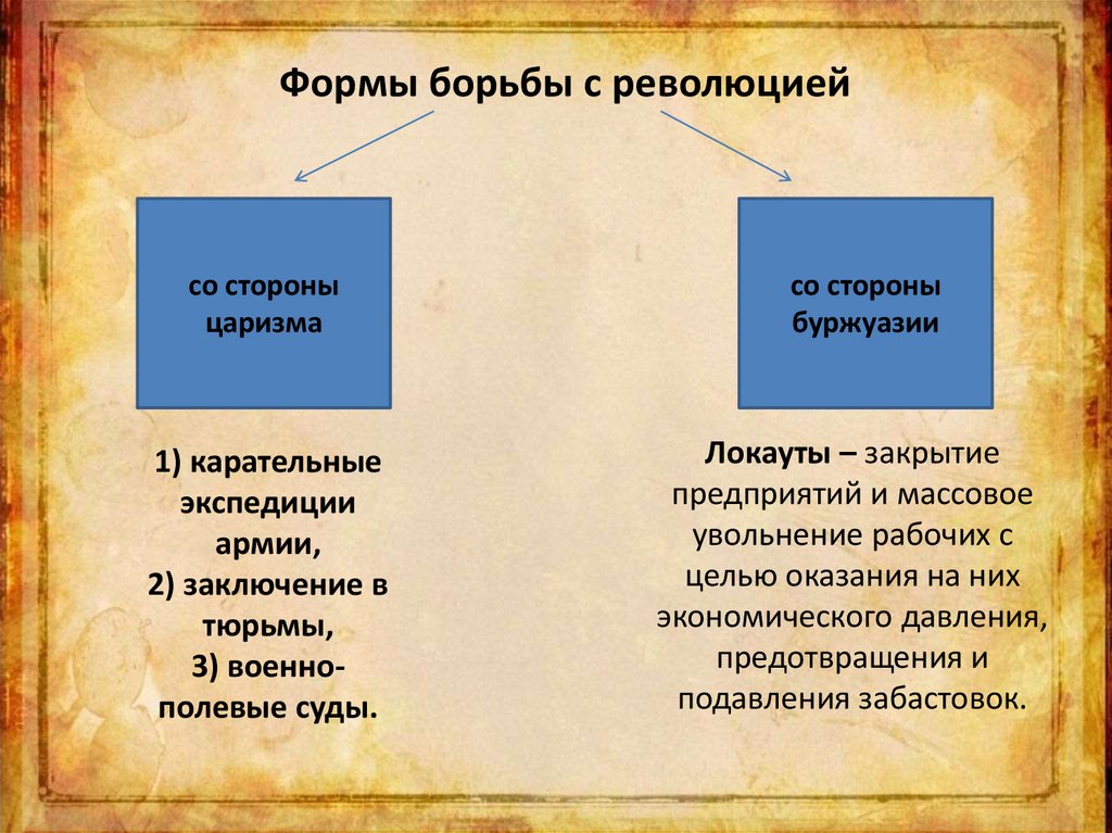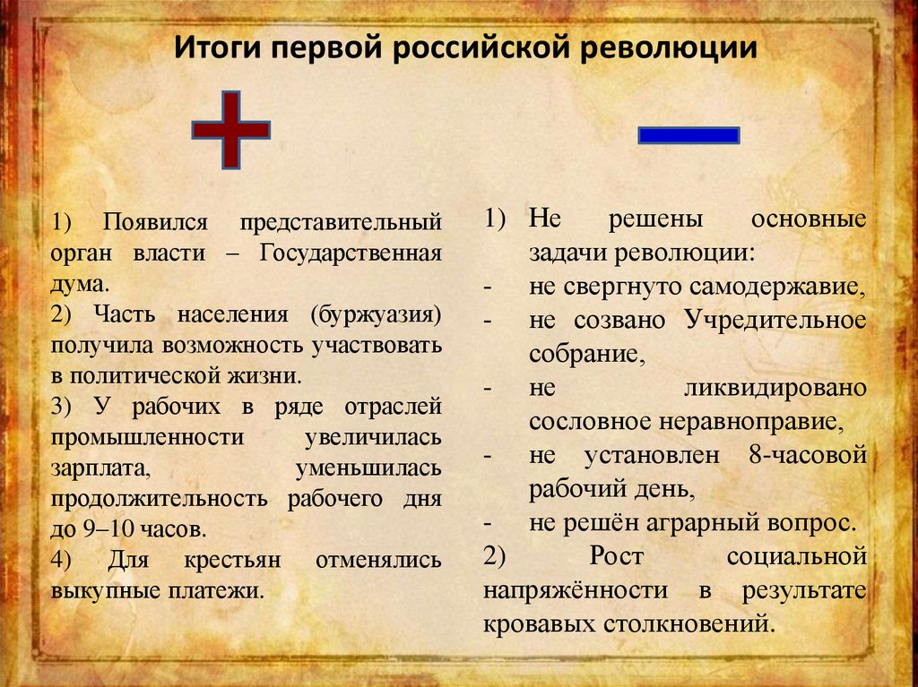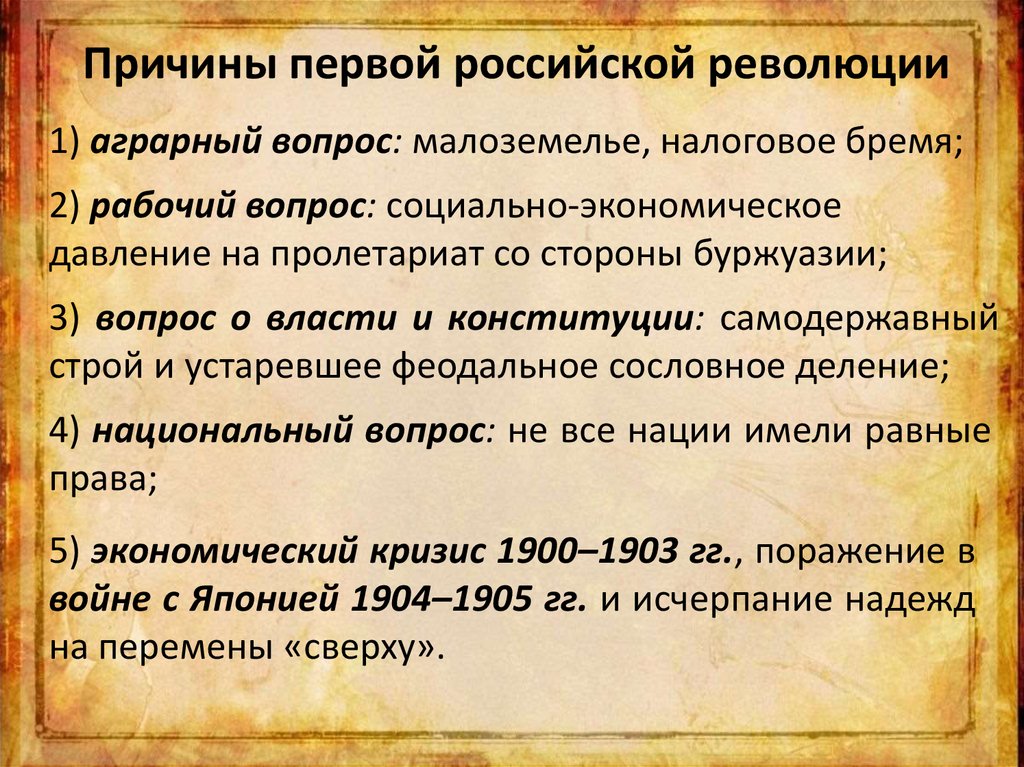 Причины первой российской революции1) аграрный вопрос: малоземелье, налоговое бремя;