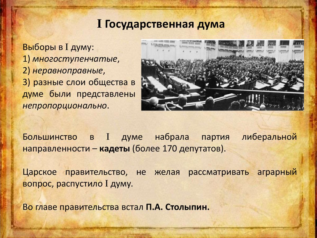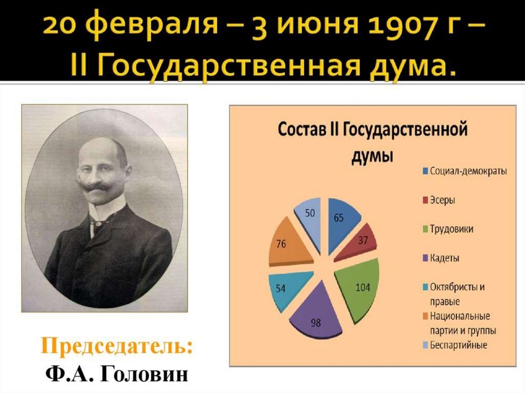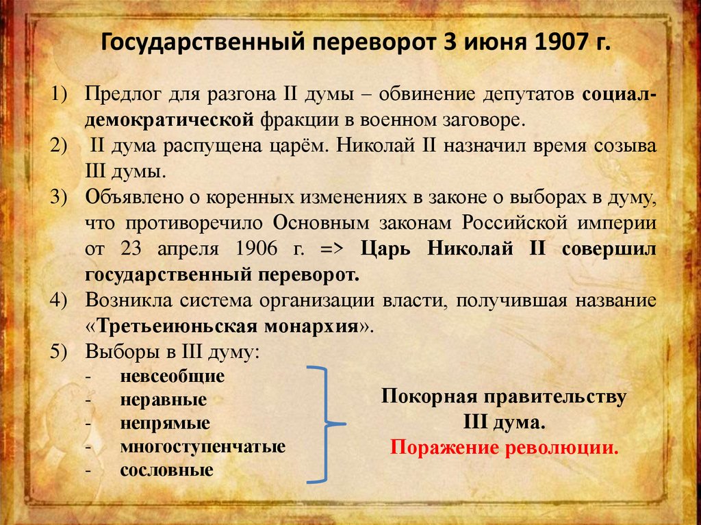 Государственный переворот 3 июня 1907 г.1) Предлог для разгона II думы – обвинение депутатов социалдемократической фракции в военном заговоре.