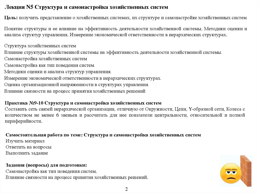 Лекция N5 Структура и самонастройка хозяйственных системЦель: получить представление о хозяйственных системах, их структуре и самонастройке хозяйственных систем