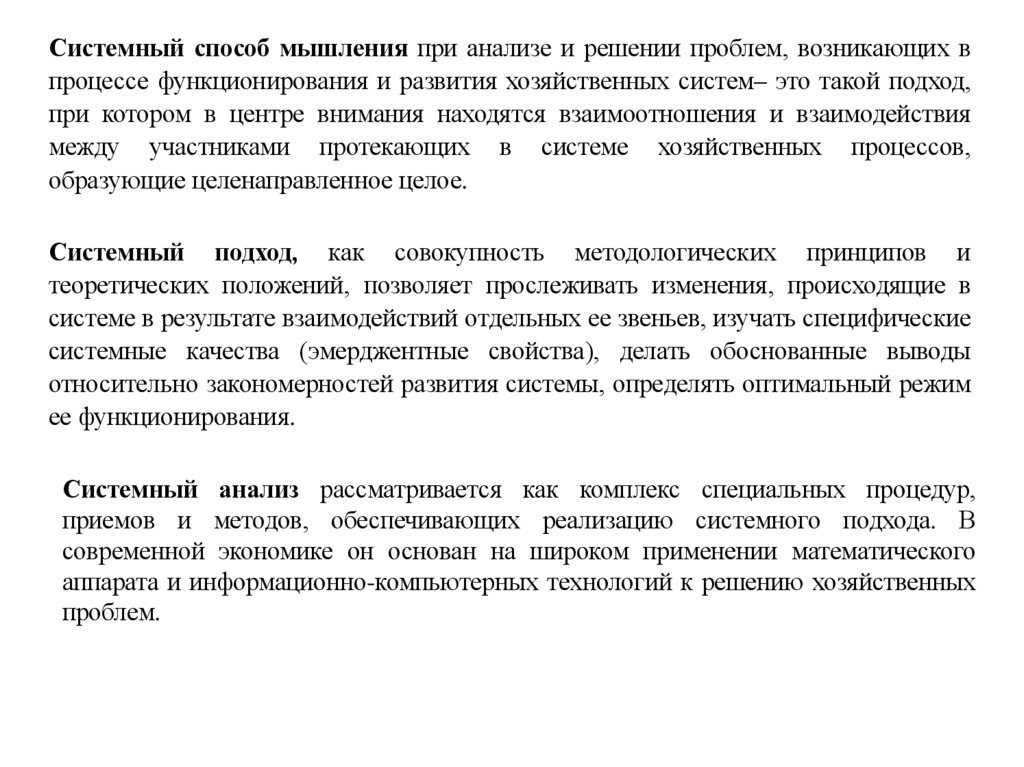 Системный способ мышления при анализе и решении проблем, возникающих впроцессе функционирования и развития хозяйственных систем– это такой подход,