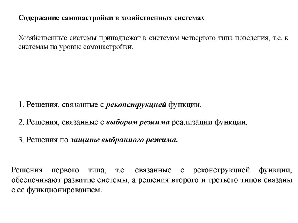 Содержание самонастройки в хозяйственных системахХозяйственные системы принадлежат к системам четвертого типа поведения, т.е. к