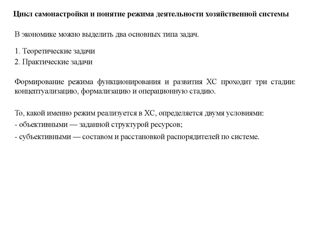 Цикл самонастройки и понятие режима деятельности хозяйственной системыВ экономике можно выделить два основных типа задач.