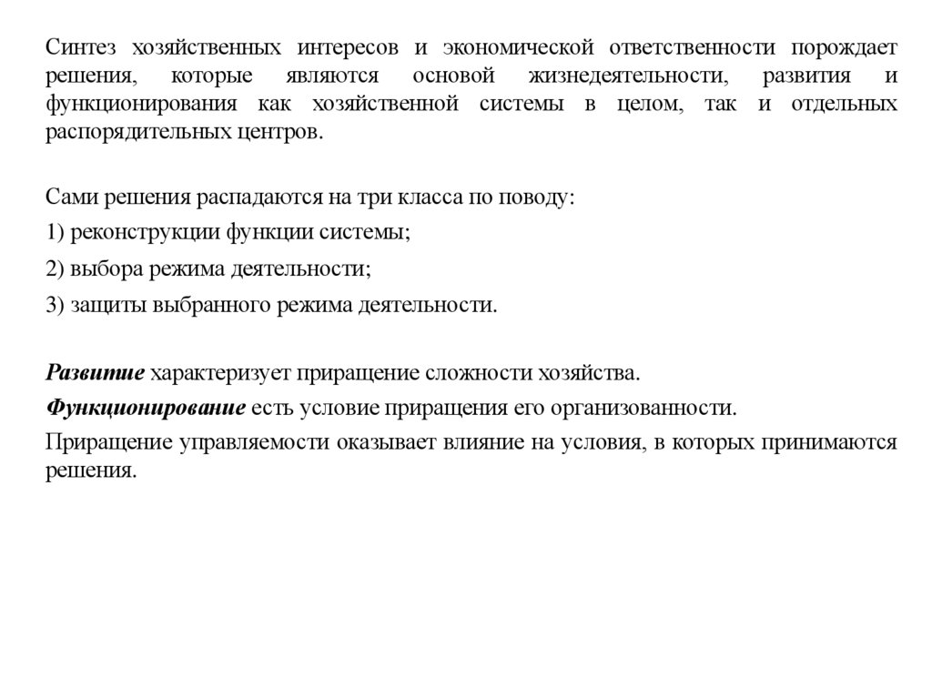 Синтез хозяйственных интересов и экономической ответственности порождаетрешения, которые являются основой жизнедеятельности, развития и