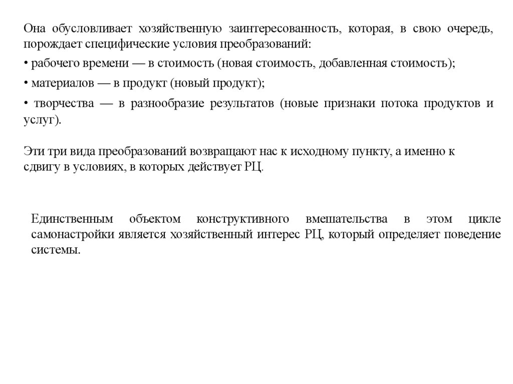Она обусловливает хозяйственную заинтересованность, которая, в свою очередь,порождает специфические условия преобразований: