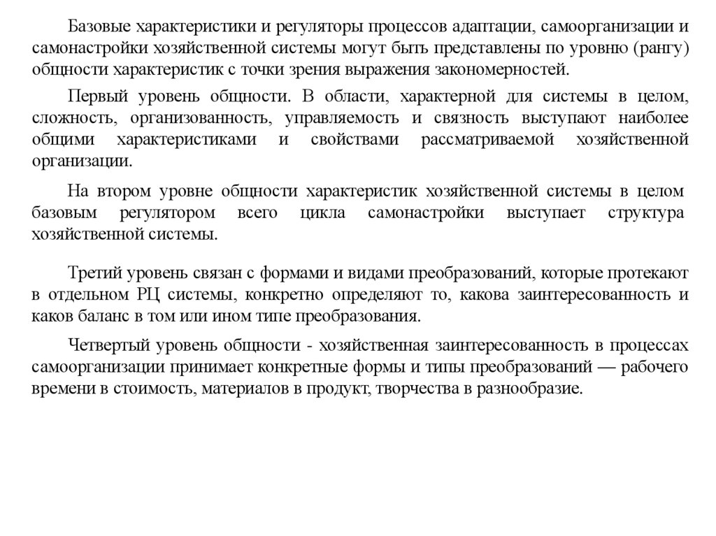 Базовые характеристики и регуляторы процессов адаптации, самоорганизации исамонастройки хозяйственной системы могут быть представлены по уровню (рангу)