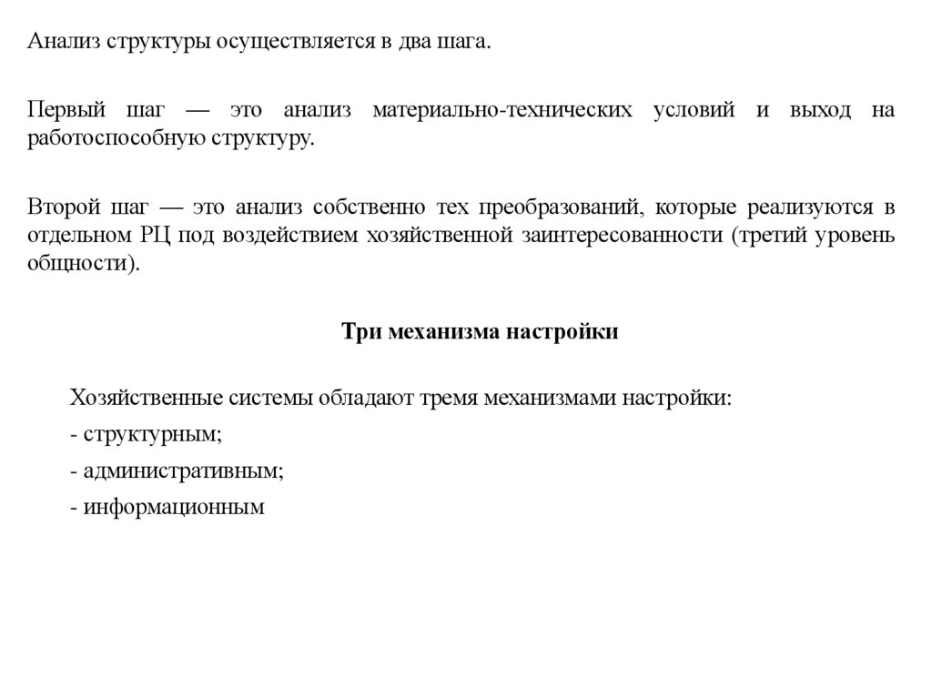 Анализ структуры осуществляется в два шага.Первый шаг — это анализ материально-технических условий и выход на