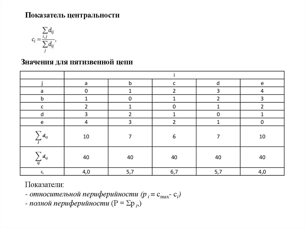 количеством не менее 6 звеньев и рассчитать для нее показатели центральности, относительной и полной