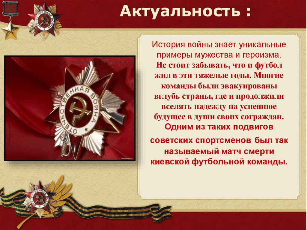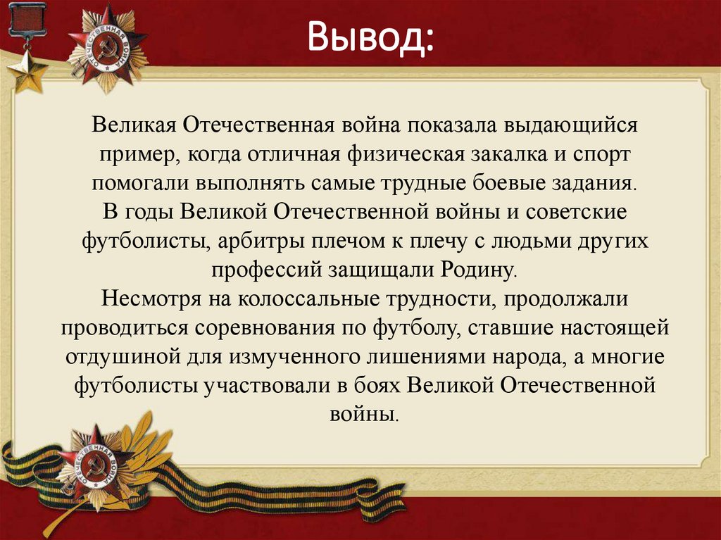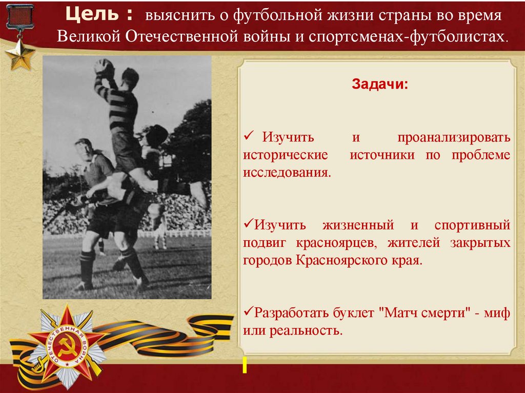 Цель : выяснить о футбольной жизни страны во времяВеликой Отечественной войны и спортсменах-футболистах.