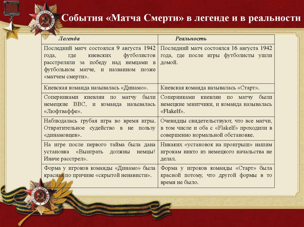 События «Матча Смерти» в легенде и в реальностиЛегенда