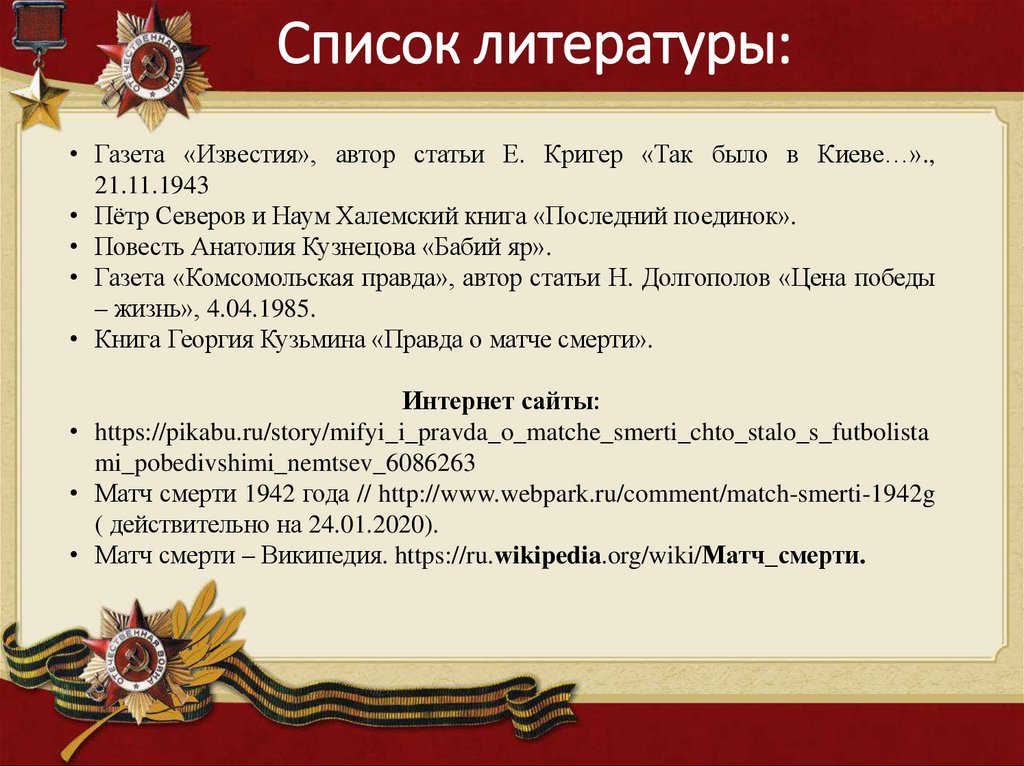 • Матч смерти – Википедия. https://ru.wikipedia.org/wiki/Матч_смерти.