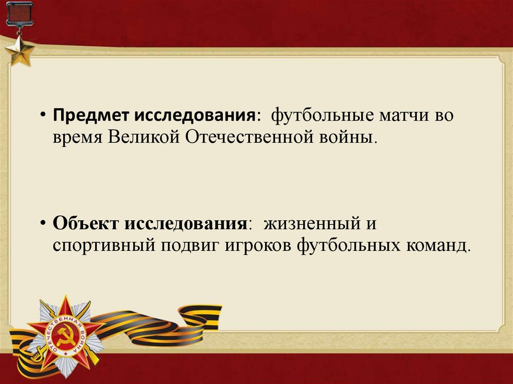 • Предмет исследования: футбольные матчи вовремя Великой Отечественной войны.