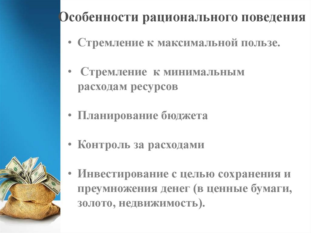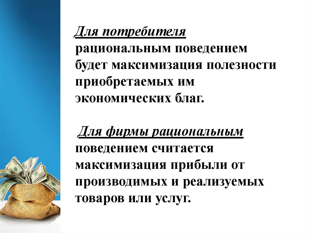 Особенности рационального поведения• Стремление к максимальной пользе.
