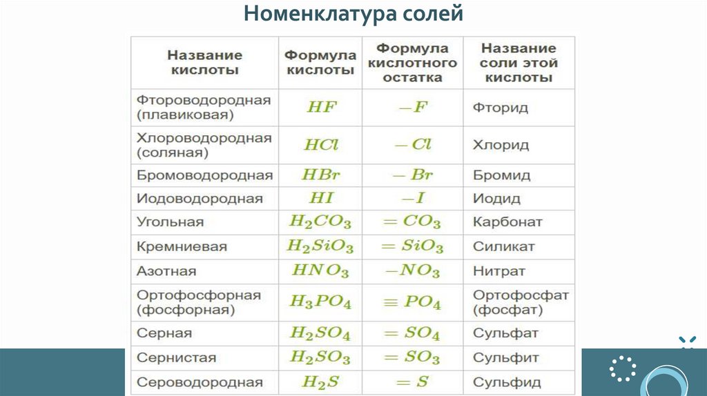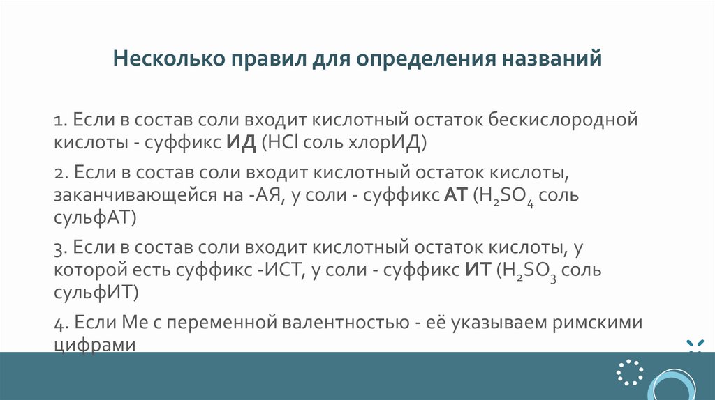 Несколько правил для определения названий1. Если в состав соли входит кислотный остаток бескислородной