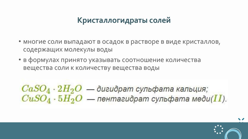 Кристаллогидраты солей• многие соли выпадают в осадок в растворе в виде кристаллов,