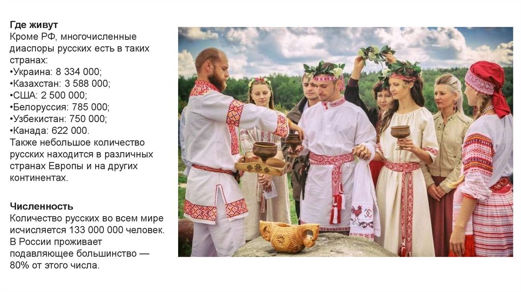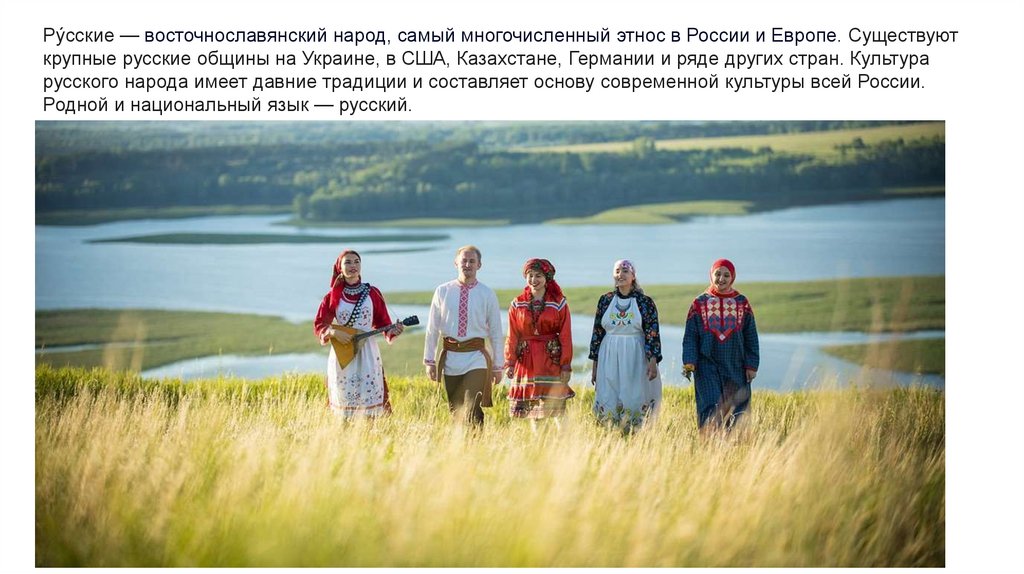 Ру́сские — восточнославянский народ, самый многочисленный этнос в России и Европе. Существуюткрупные русские общины на Украине, в США, Казахстане, Германии и ряде других стран. Культура