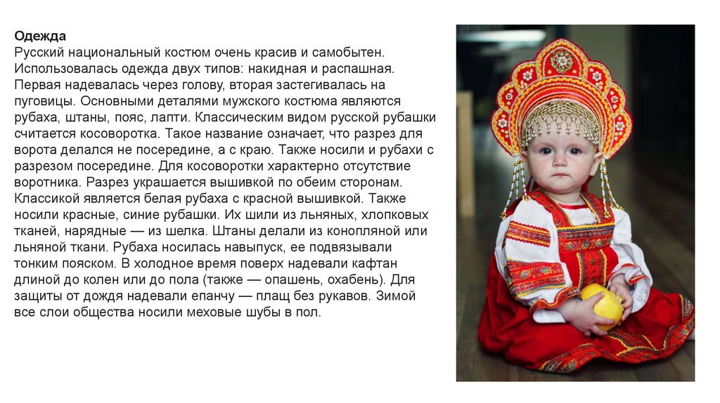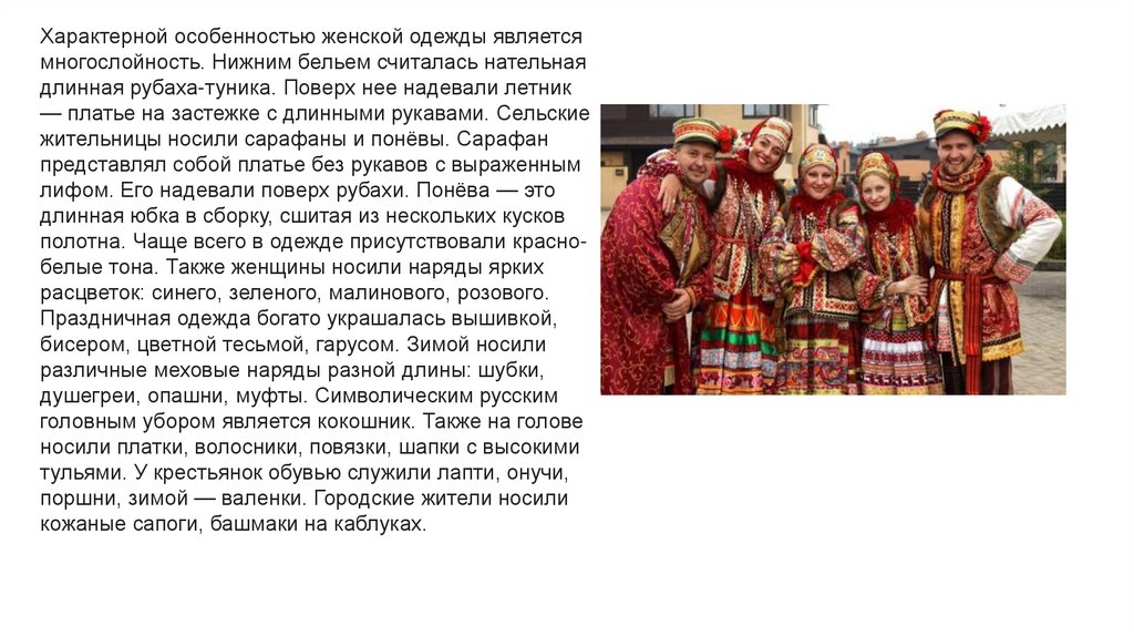 ОдеждаРусский национальный костюм очень красив и самобытен.
