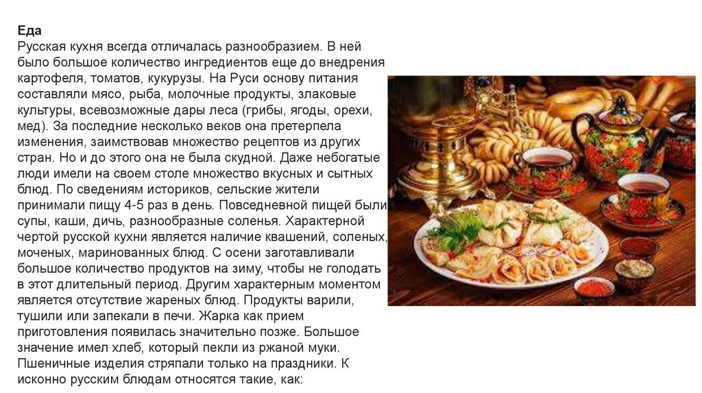 ЕдаРусская кухня всегда отличалась разнообразием. В ней