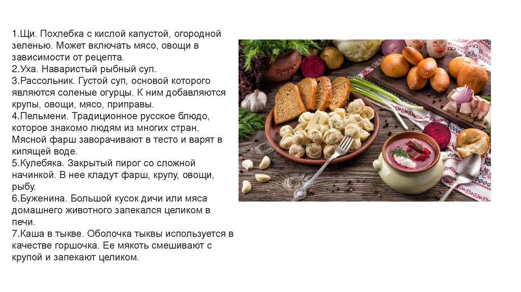 1.Щи. Похлебка с кислой капустой, огороднойзеленью. Может включать мясо, овощи в