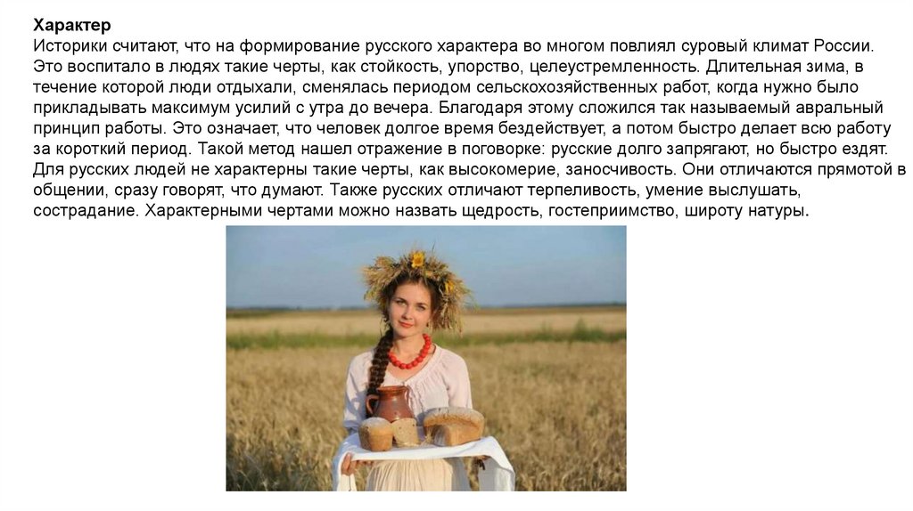 ХарактерИсторики считают, что на формирование русского характера во многом повлиял суровый климат России.