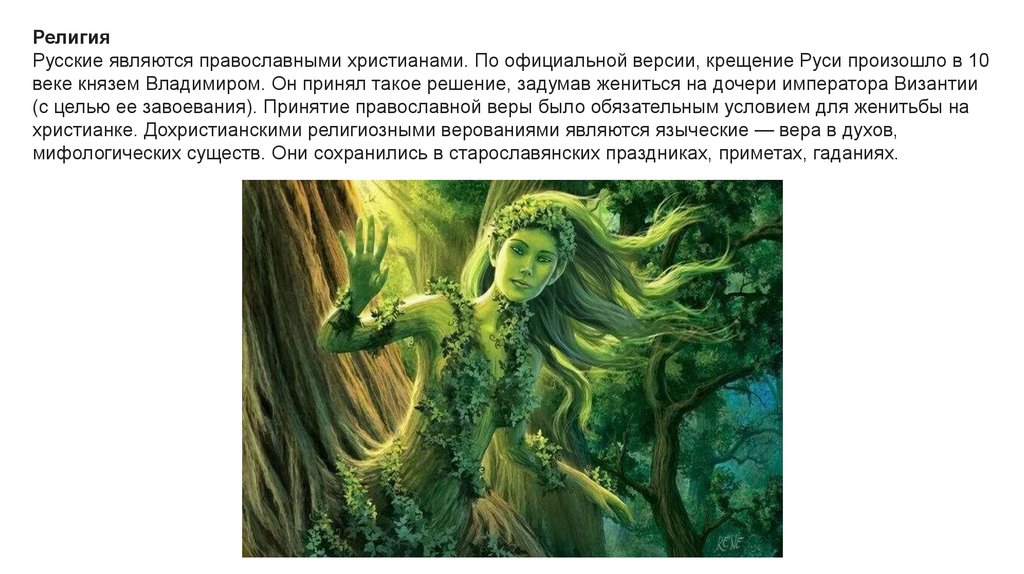 РелигияРусские являются православными христианами. По официальной версии, крещение Руси произошло в 10