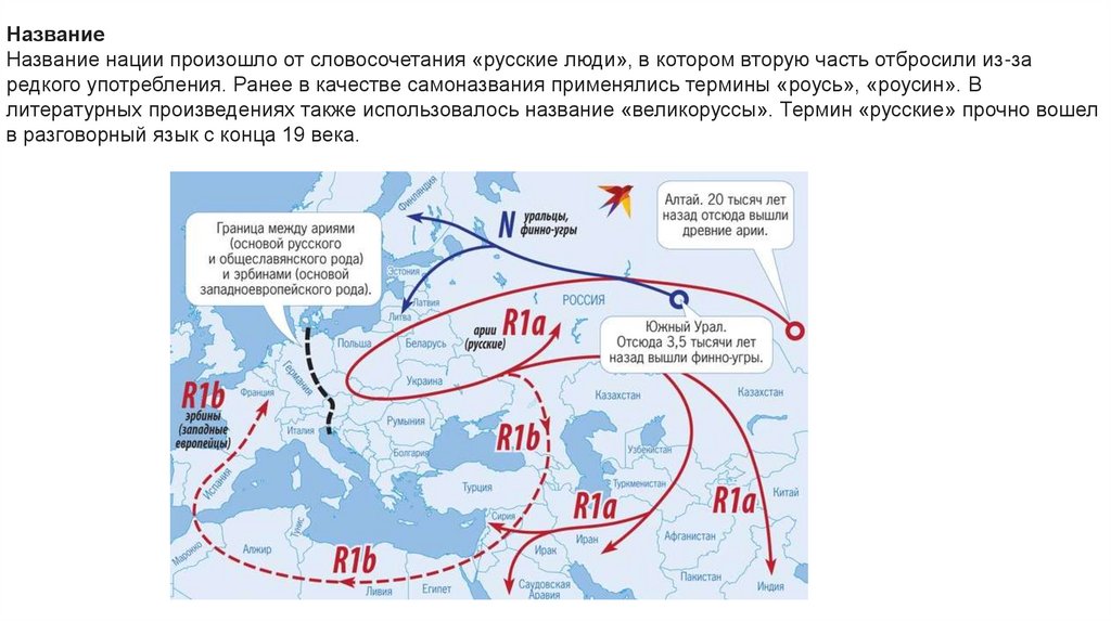 НазваниеНазвание нации произошло от словосочетания «русские люди», в котором вторую часть отбросили из-за