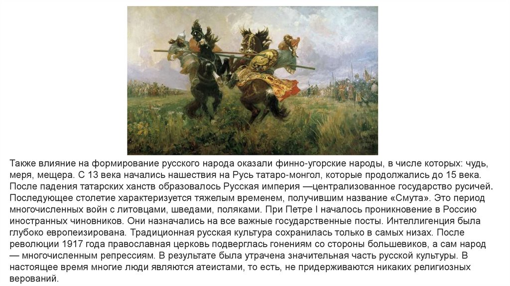 Также влияние на формирование русского народа оказали финно-угорские народы, в числе которых: чудь,меря, мещера. С 13 века начались нашествия на Русь татаро-монгол, которые продолжались до 15 века.