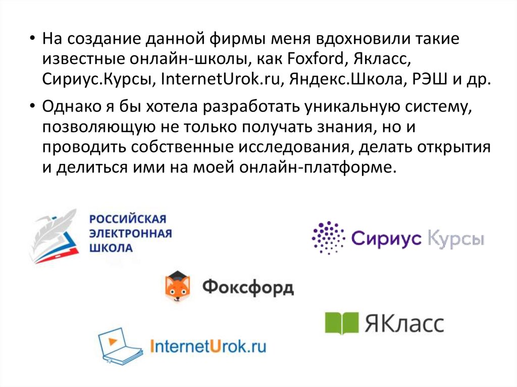 • На создание данной фирмы меня вдохновили такиеизвестные онлайн-школы, как Foxford, Якласс,